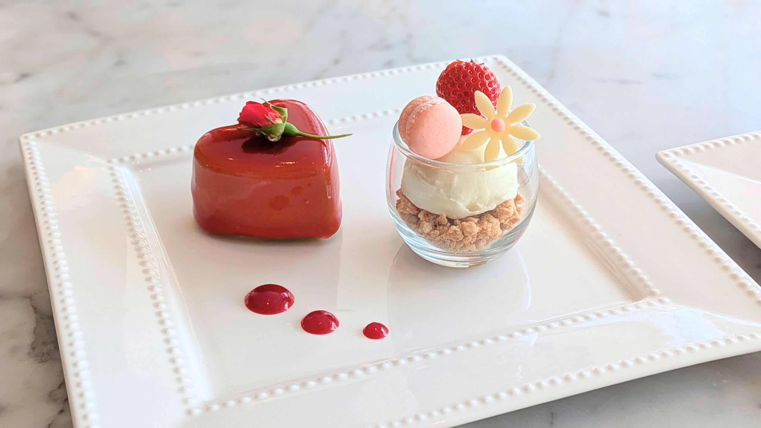 春の訪れにぴったりなかわいいハートのケーキとアイスクリーム、ミニマカロン、イチゴ等を飾った華やかなスイーツプレートです。