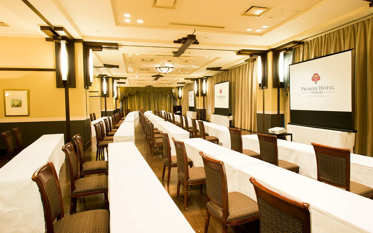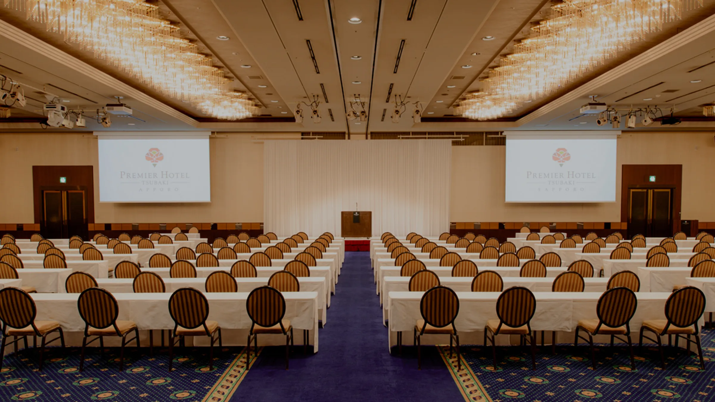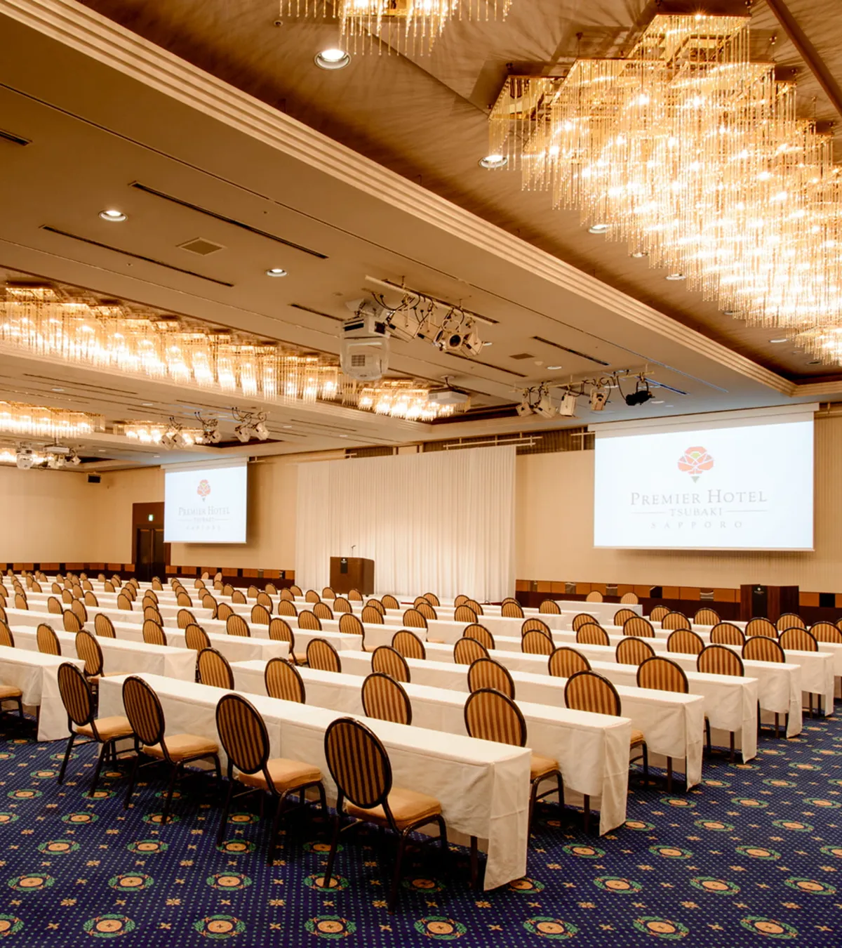 プレミアホテル-TSUBAKI-札幌の大宴会場「カメリア」は、最大収容人数1,400名、面積1,100㎡、天井高4.9mを誇る札幌市内でも最大級のスケール。同じフロアには他の小・中宴会場もあるため、複数の会場を同時に利用することも可能です。