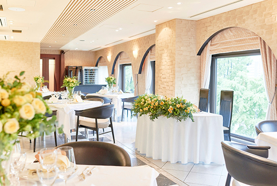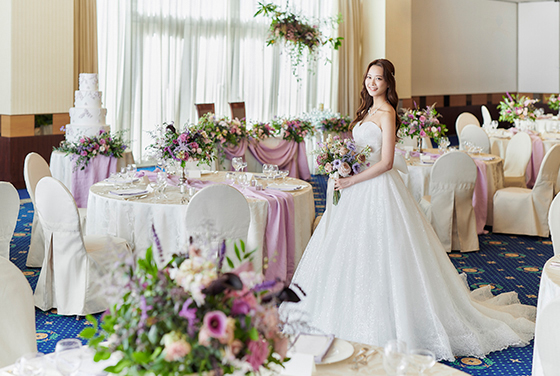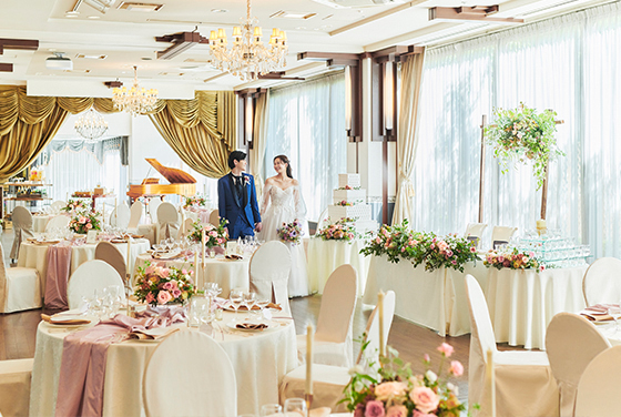 窓から差し込む陽の光がドレスや会場コーディネートを輝かせ華やいだパーティを演出するバンケット エレガントさの中にスイートを併せ持つ空間でゲストの笑顔に包まれながら優雅でプレシャスなひと時を過ごせます