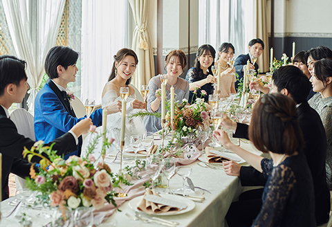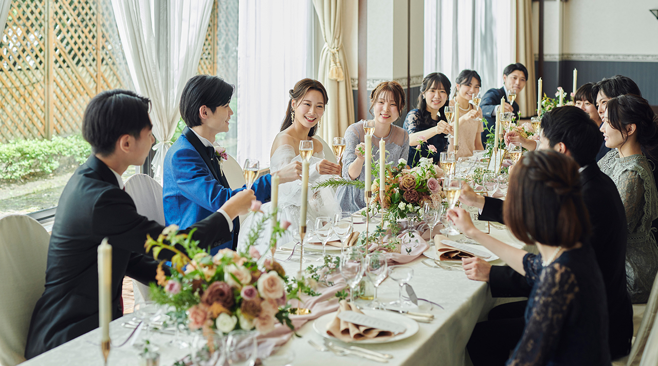 おふたりとご家族皆様で同じテーブルを囲んでお食事をするスタイルからグループごとに分けて楽しむスタイルなどレイアウトも自由にアレンジが可能 ご家族や親しい方を招いての少人数婚には最適なサイズです