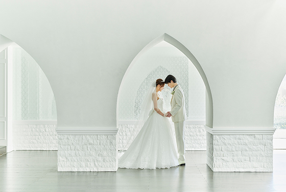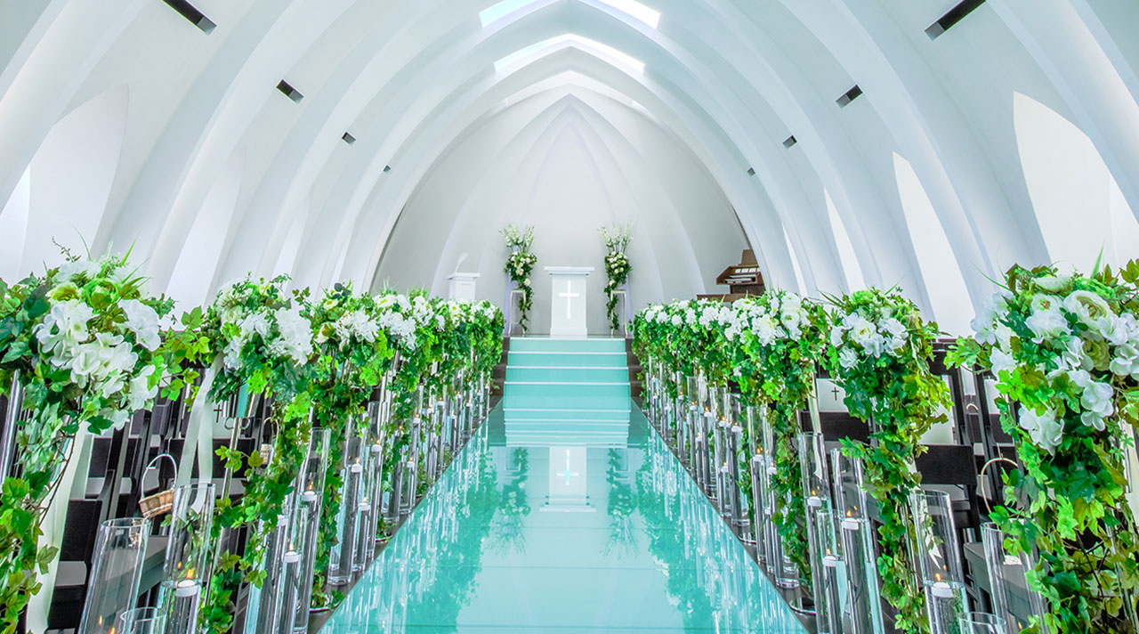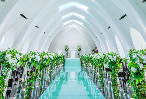 96名まで収容できる空間でもゲストからおふたりの姿がよく見えるよう祭壇には高さを備え階段にはウエディングドレスが美しく広がり最高の花嫁姿を祝福してもらえます