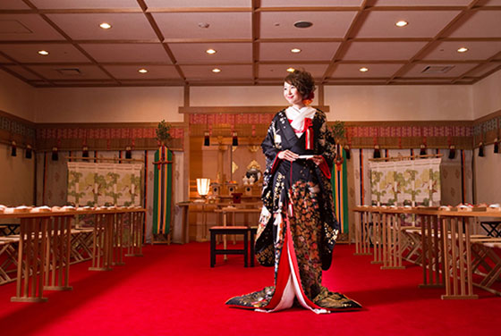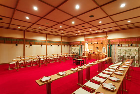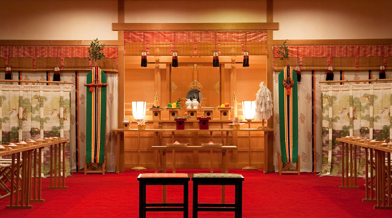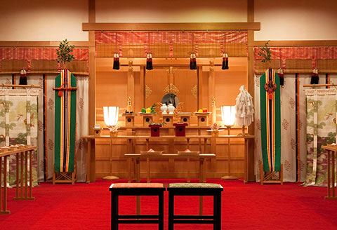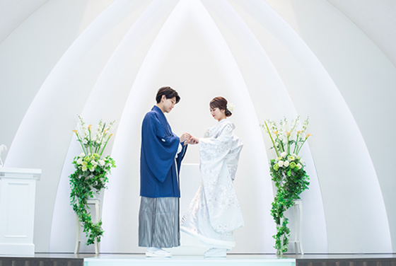 スカイライトチャペルに和のテイストを取り入れた優美な空間での和装人前式 神社での挙式とは違い大事なゲスト全員に誓いの瞬間を見守ってもらえる他 進行を自由にお決めいただけます