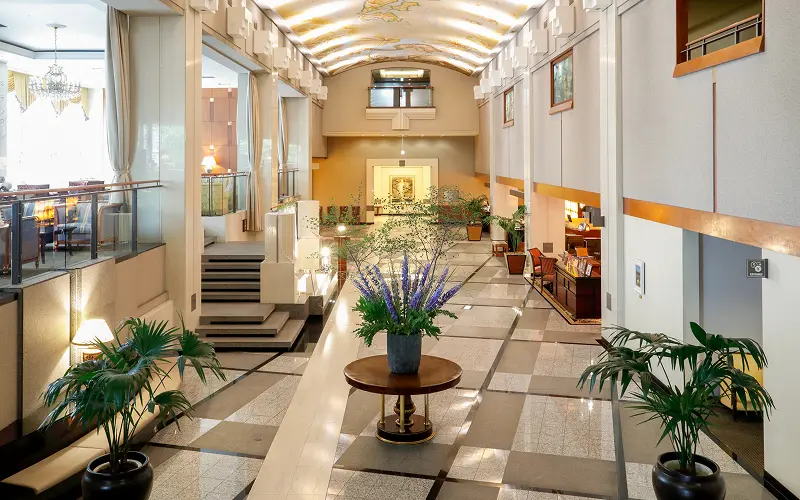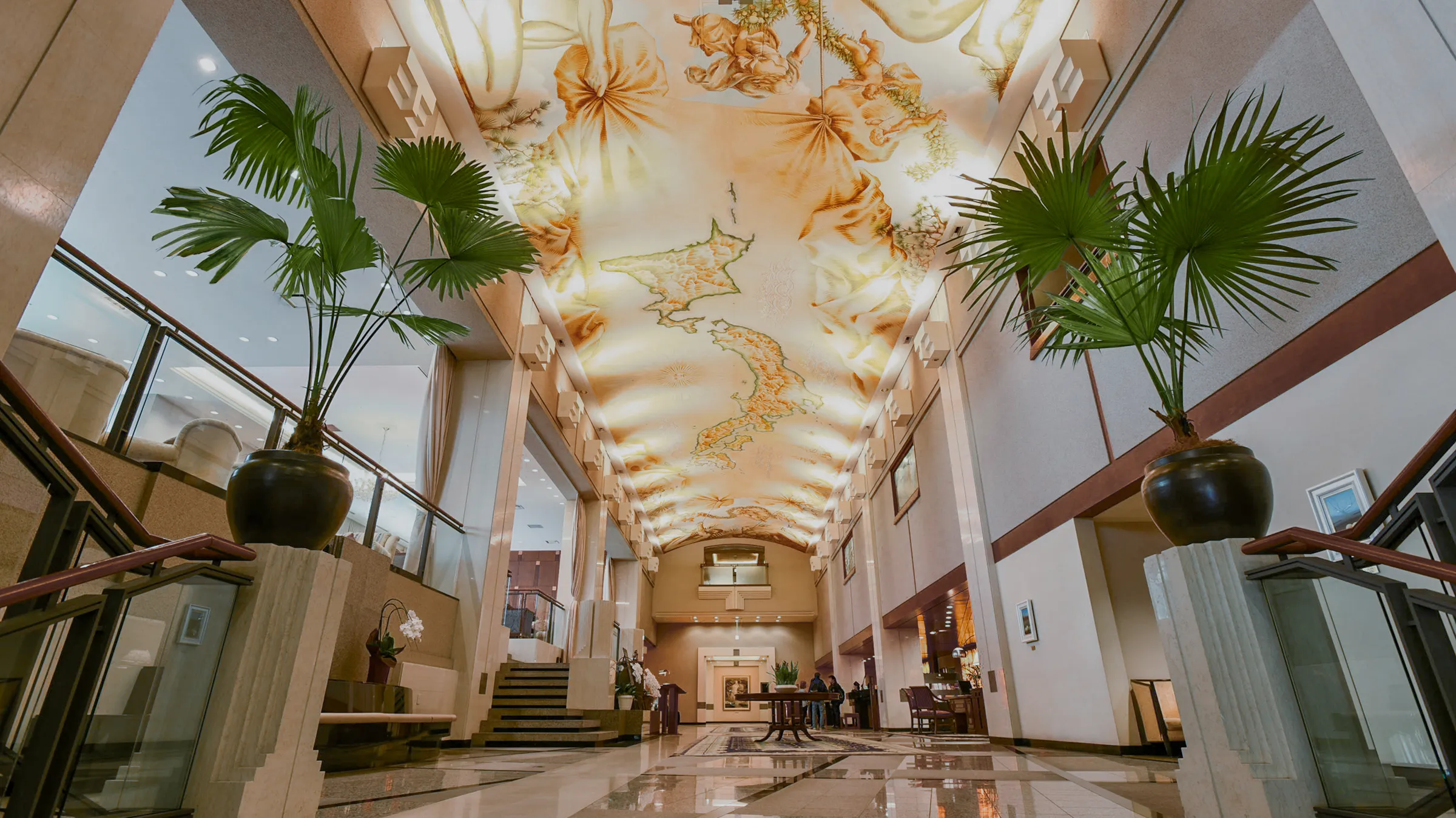 荘厳な天井画が見守るロビー、
