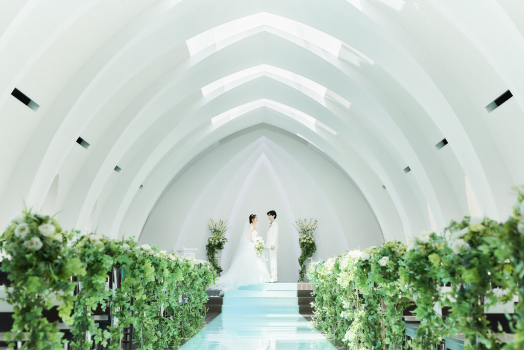 天窓から陽光が降り注ぎ 連なる純白のアーチと長さ20mのバージンロードが2人を祝福します
