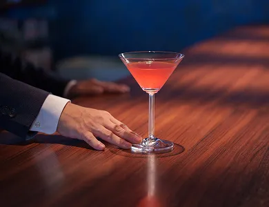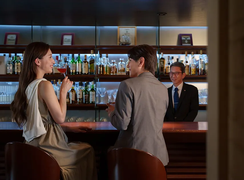 ステイタスラウンジで食事前のくつろぎの一杯。